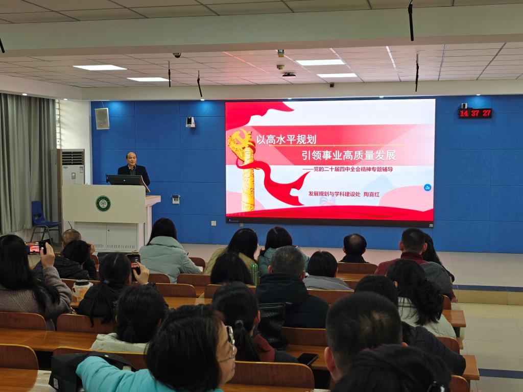 为深入学习贯彻党的二十届四中全会精神,切实提升学院发展规划与学科建设水平,12月26日我院邀请学校学习贯彻党的二十届四中全会精神宣讲团成员、发展规划与学科建设处处长陶喜红教授为全院教职工作题为“以高水平规划引领事业高质量发展——党的二十届四中全会精神专题辅导”报告。报告会由学院党委书记李春雷主持。
