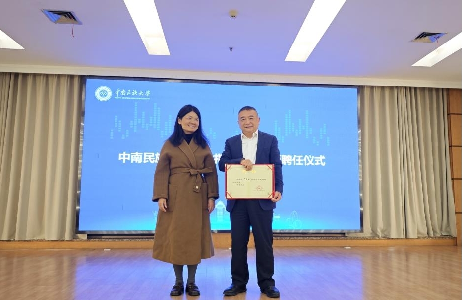 李红燕为严长胜校友颁发聘书。刘毅摄
