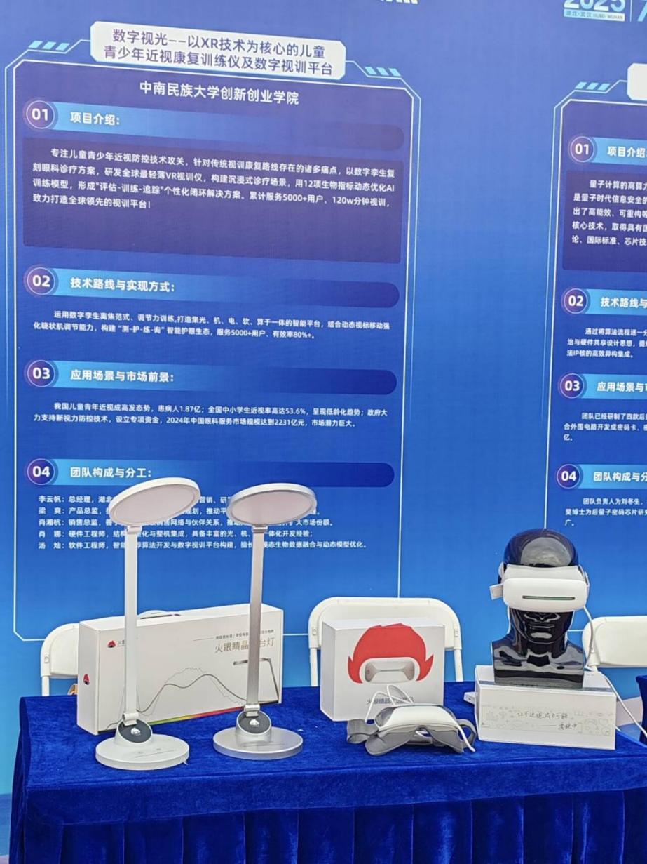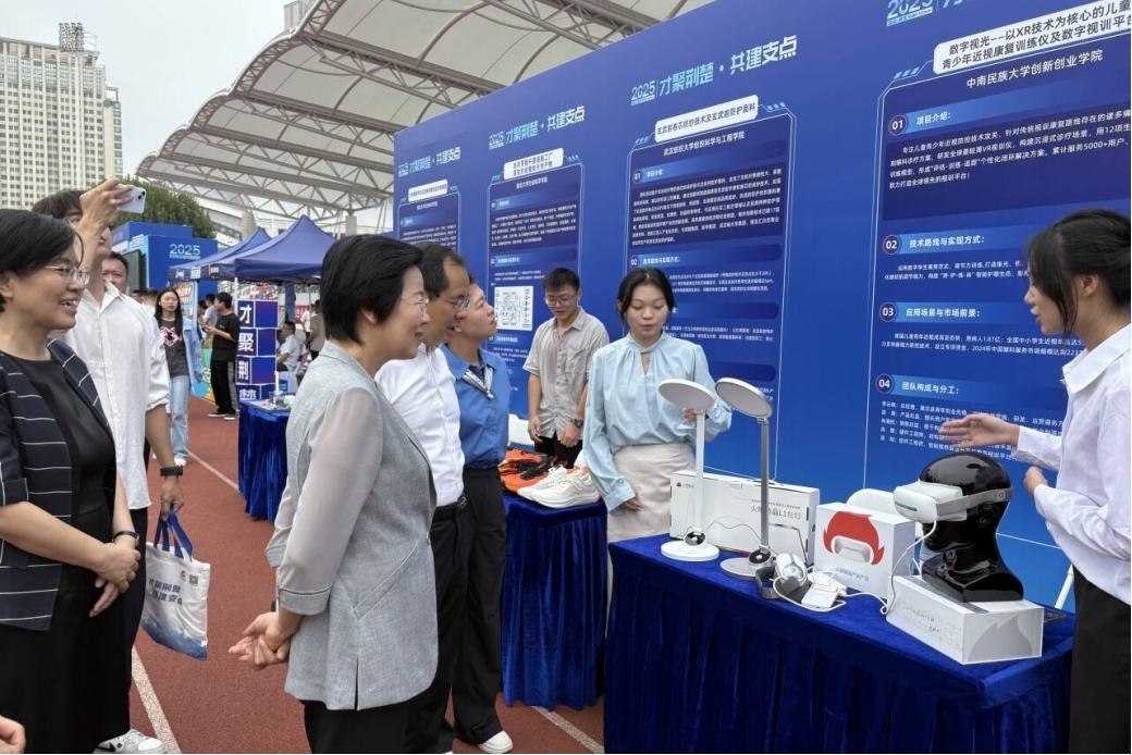 9月28日,2025才聚荆楚·共建支点湖北省国企招聘会在华中科技大学拉开帷幕。此次招聘会由湖北省人力资源和社会保障厅、湖北省人民政府国有资产监督管理委员会、华中科技大学联合主办,吸引了近700家企业参与,提供岗位超40000个。在招聘会的青年创新创业成果展示区,我校创新创业学院推荐展出的项目“数字视光——以XR技术为核心的儿童青少年近视康复训练仪及数字视训平台”备受瞩目。