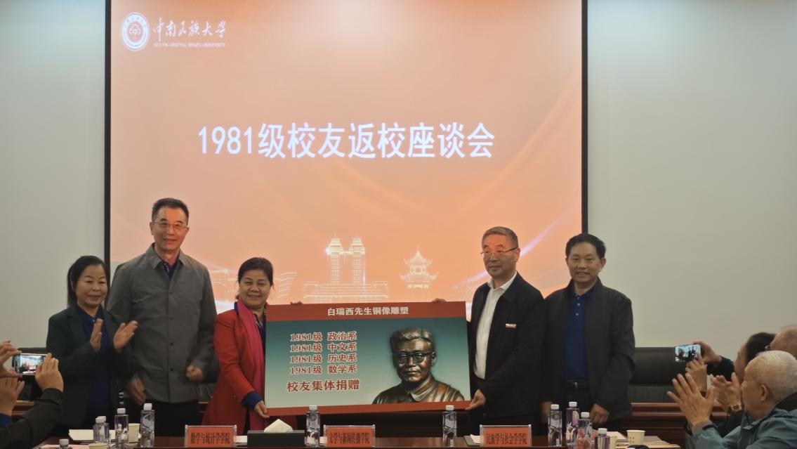 会上还举行了捐赠仪式,1981级全体校友向母校捐赠中南民族学院原院长白瑞西先生雕像。刘义代表学校接受了捐赠。此外,1981级校友还捐赠了自己保存的当时的助学金发放名册等资料。