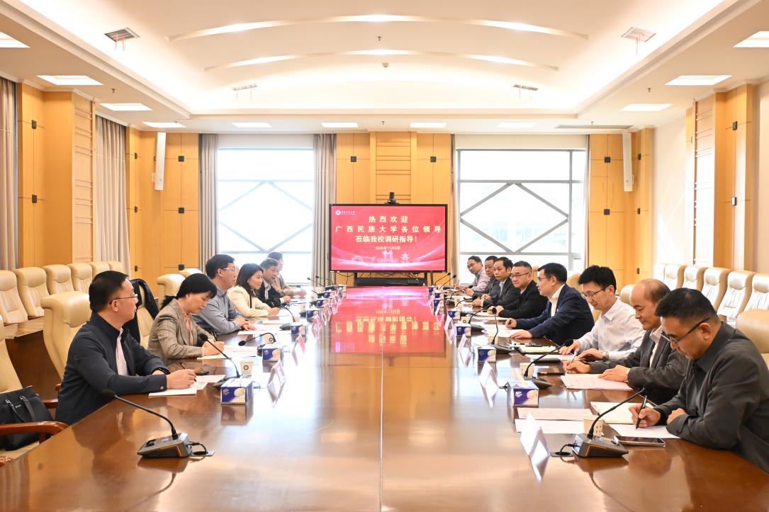 11月3日下午,广西民族大学党委书记唐平秋一行来校调研座谈。座谈会在学术交流中心举行。校党委书记徐业勤,党委常委、副校长方德斌以及两校相关部门负责人参加座谈会。会议由徐业勤主持。