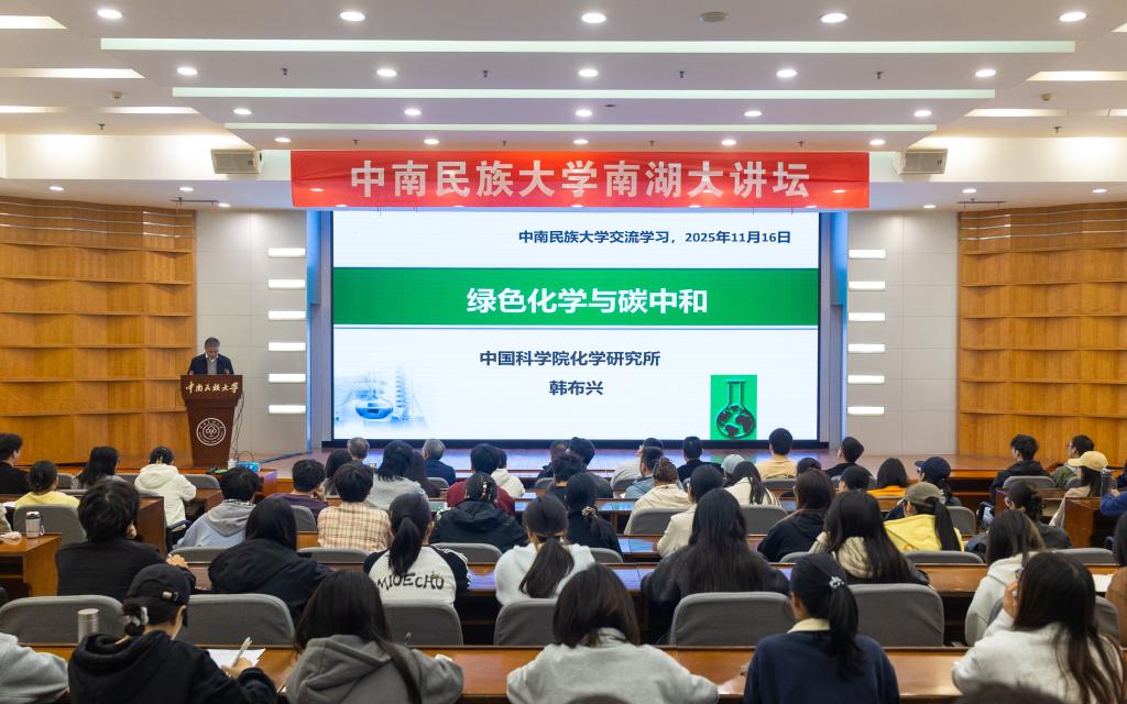 11月16日,我校第六十六期“南湖大讲坛”在学校学术交流中心举行。中国科学院院士、发展中国家科学院院士、中国科学院化学研究所研究员韩布兴教授应邀作题为“绿色化学与碳中和”的专题讲座。化学与材料科学学院等全校百余名师生到场聆听,现场气氛热烈。讲座由我校党委副书记、校长刘义主持。
