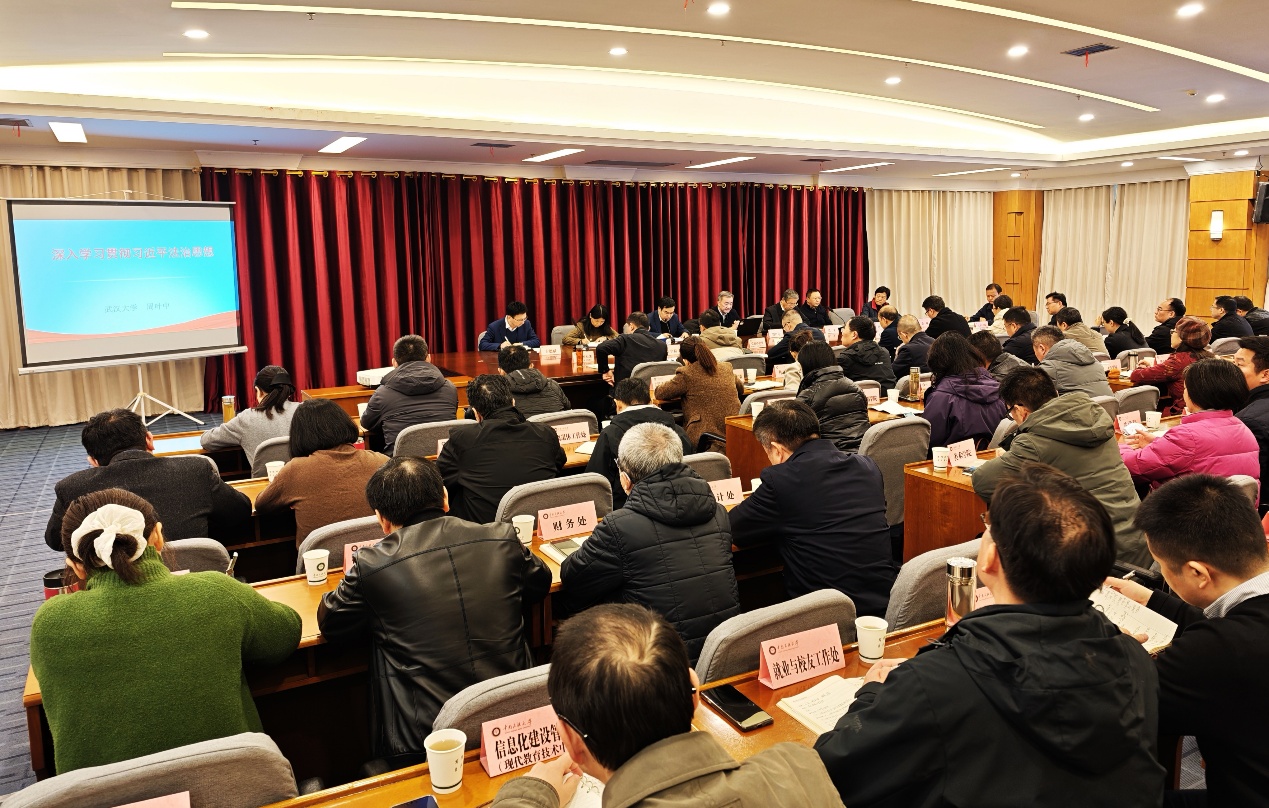 12月12日上午,学校党委理论学习中心组召开集中学习会,围绕习近平法治思想开展专题学习和交流研讨。全体在校校领导、党委常委,各学院、职能部门、直属单位主要负责同志参加学习,湖北省教育厅综合治理处四级调研员曾维列席指导。校党委书记徐业勤主持学习会并作总结讲话。