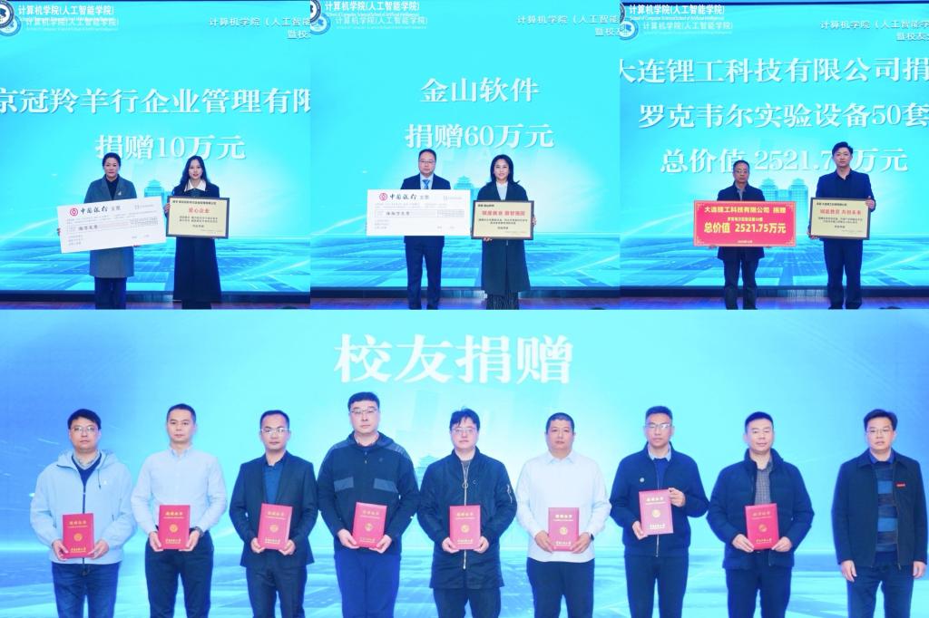 大会还举行了校友和企业捐赠仪式。涂小辉、许前磊、曹钧等众多校友慷慨捐赠近30万元,设立学院奖(助)学金,助力学院发展。南京冠羚羊行企业管理有限公司捐赠资金10万元、武汉金山软件有限公司捐赠资金60万元、大连锂工科技有限公司捐赠罗克韦尔实验设备50套,价值2521.75万元。