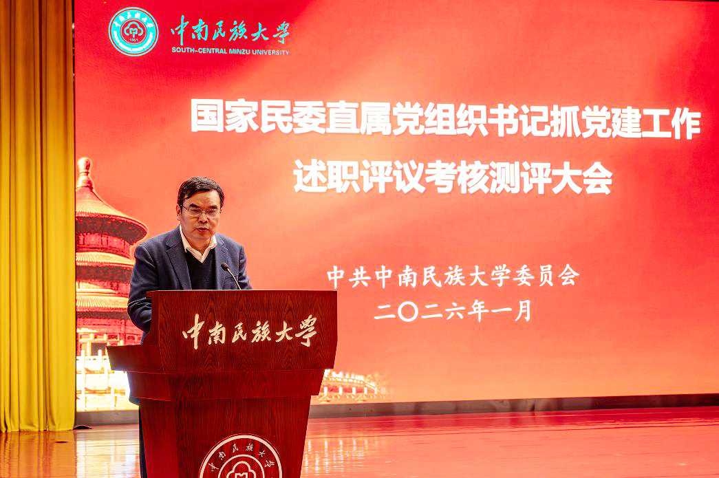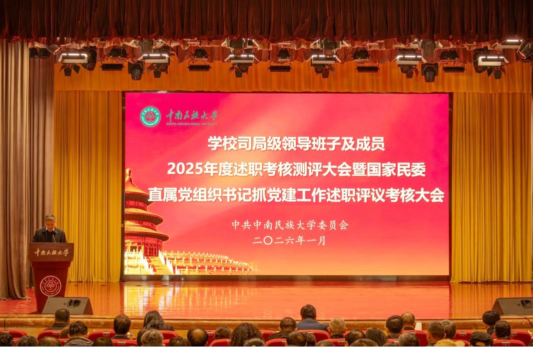 1月14日下午,按照国家民委党组、湖北省委关于2025年度考核工作的统一部署,学校召开司局级领导班子及成员2025年度综合述职考核测评大会暨国家民委直属党组织书记抓党建工作述职评议考核大会。国家民委人事司领导、全体在校校领导、校党委常委、各单位党政主要负责人、其他正处级干部、正高级职称专业技术人员、教代会代表参加会议。会议由校党委副书记、校长刘义主持。