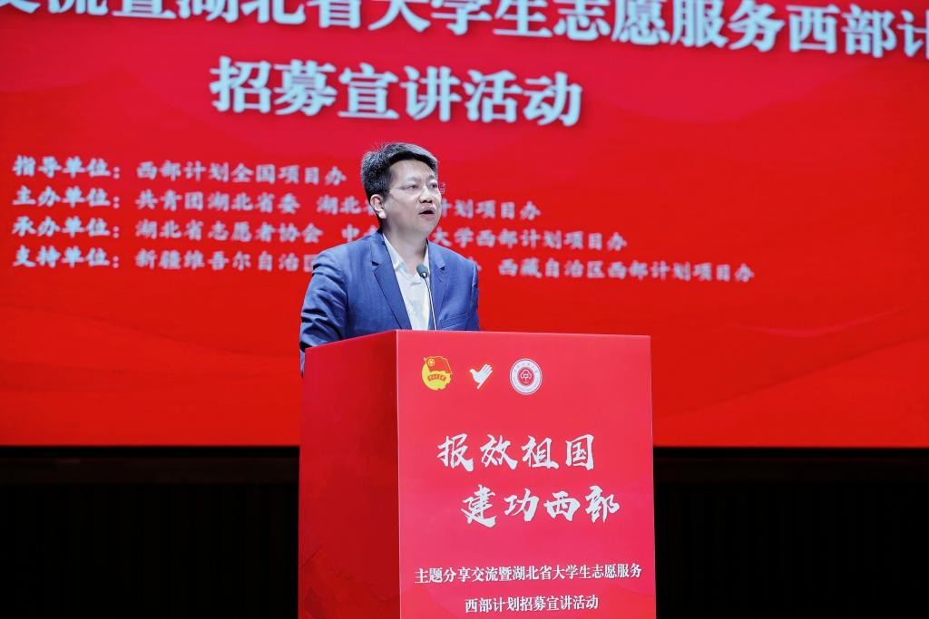 4月9日,“报效祖国 建功西部”主题分享交流暨湖北省大学生志愿服务西部计划招募宣讲活动在我校举行。团中央青年志愿者行动指导中心主任赵博,共青团湖北省委书记刘治田,省人社厅二级巡视员张学清,省教育厅二级巡视员姚刚,省农业农村厅二级巡视员张燕科,我校党委书记徐业勤,党委常委、副校长马玉堂等领导出席活动。活动采取线上线下相结合的方式进行,部分高校西部计划项目办负责人和师生代表共计600余人现场参与活动,37所高校的4500余名师生通过腾讯会议线上同步收听收看。