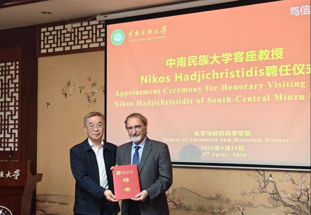 4月25日下午,我校举行客座教授聘任仪式,聘请国际著名高分子科学家、沙特阿卜杜拉国王科技大学(KAUST)杰出教授Nikos Hadjichristidis为我校客座教授。校长刘义为Hadjichristidis教授颁发聘书。化学与材料科学学院师生代表约50人参加了仪式。