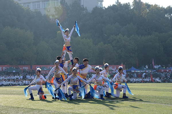 各显特色的方阵走过,精彩的文体展演又给开幕式增添了别样风采。体育学院民族健身操基地的《雪域节拍》、体育学院舞龙舞狮队的《双龙戏珠》、校团委舞蹈团的《宴》、音乐舞蹈学院的《太阳鼓》等尽在其中。全校24个基层工会的600名教职工组成的广播体操方阵颇为引人注目,他们身姿飒爽,精神饱满,动作整齐划一、规范有力。5名队员入选国家队、斩获3个世界冠军的体育学院跳绳队带来的花样跳绳更是嗨翻全场。绳影起落间,表演者空翻跃起,单人跳多人跳轮番上阵,让师生直呼“过瘾”。