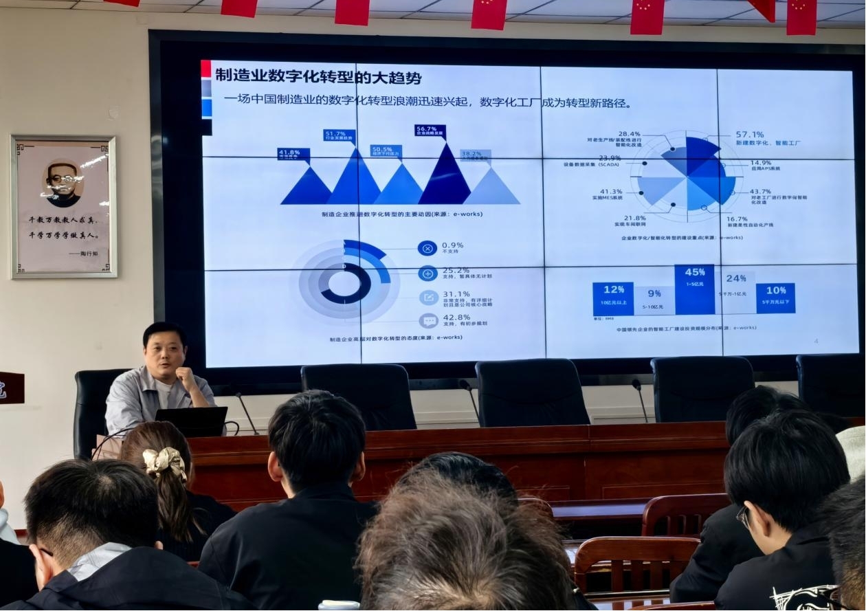 10月29日,由研究生院和计算机学院(人工智能学院)联合主办的《从“制造”到“智造”:AI驱动下的工厂智能》专题讲座在9号教学楼举行。东风设备数字智能科技作业部首席工程师刘继斌应邀主讲,计算机学院(人工智能学院)和学校其他兄弟学院近百名研究生参加学习。讲座由计算机学院(人工智能学院)院长帖军主持。