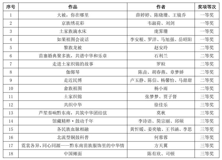 本次大赛以“视频说中华”为主题,依托我校民族学博物馆馆藏文物资源,引导青年学子用镜头语言解码文物背后的中华民族共同体密码,涌现出一批兼具学术深度与传播活力的优秀作品。为确保评审专业性,民族学博物馆成立了大赛作品评审小组,由民族学博物馆副馆长庾华担任评审会主持人,成员包括民族学博物馆副馆长林毅红、创新创业学院副院长杨海健、校团委副书记蓝永丽、民族学博物馆公共服务部主任蓝李丹。评审小组从主题契合度、文物关联性、艺术表现力、传播价值4个维度对作品进行严格筛选,最终评选出一等奖4名、二等奖6名、三等奖8名以及优秀奖若干。详情如下:
