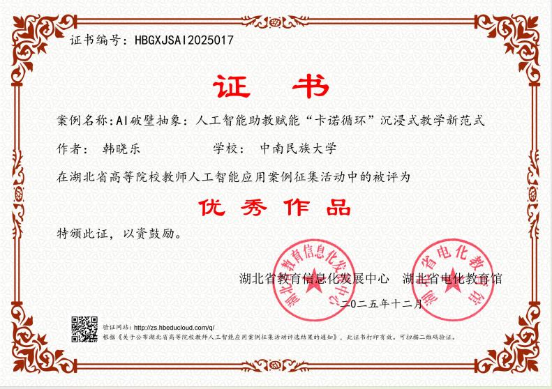 12月17日,湖北省高等院校教师人工智能应用案例优秀作品名单公布,我校韩晓乐副教授的案例《AI破壁抽象:人工智能助教赋能“卡诺循环”沉浸式教学新范式》成功入选。