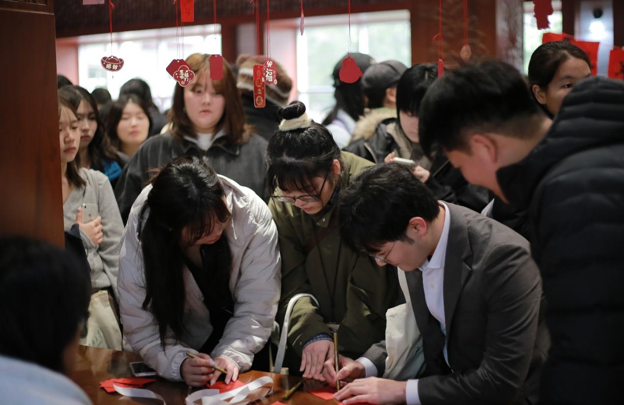 本次活动立足青年视角,探寻中华文化精髓与中国发展脉动,搭建青年间的友好交流桥梁。活动恰逢元旦佳节,中韩师生齐聚校园“元旦迎春”活动现场,沉浸式体验写春联、剪纸、编结、拓印等中华传统文化、手工艺术与浓厚的中国年味。