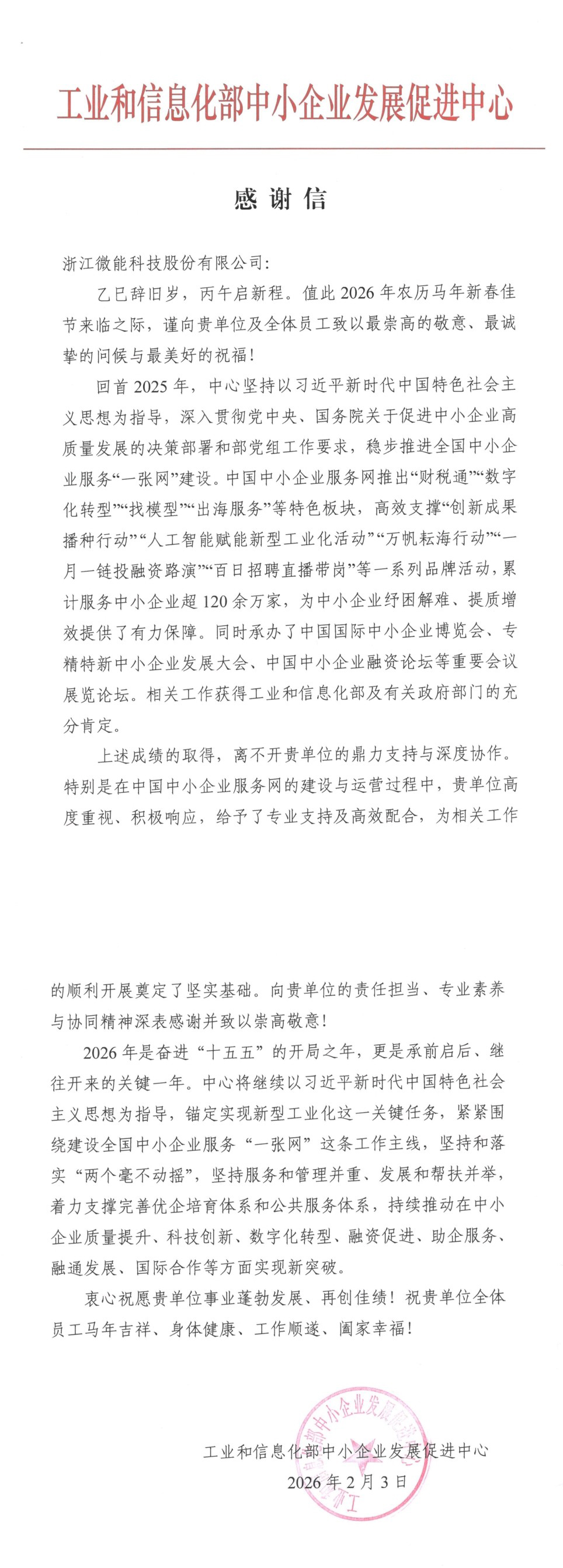 感谢信中指出,2025年工业和信息化部中小企业发展促进中心深入贯彻国家中小企业高质量发展决策部署,推进“一张网”建设取得显著成效,中国中小企业服务网推出“财税通”“数字化转型”等特色板块,支撑“创新成果播种行动”“万帆耘海行动”等系列品牌活动,累计服务中小企业超120万家,成功承办中国国际中小企业博览会等重要会议论坛,相关工作获得工信部及各级政府部门充分肯定。而这一系列成绩的背后,离不开浙江微能科技的鼎力支持与深度协作,企业在服务网建设中高度重视、积极响应,以专业技术支撑和高效执行配合,为各项工作顺利开展奠定了坚实基础。