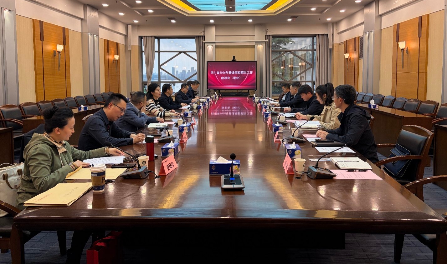 4月23日下午,四川省教育考试命题中心主任唐俊带队来校调研。我校本科生院院长胡军浩、本预科招生办公室主任黄本金,以及来自中国地质大学(武汉)、武汉理工大学、华中农业大学、中南财经政法大学等高校招生部门负责人参加座谈。