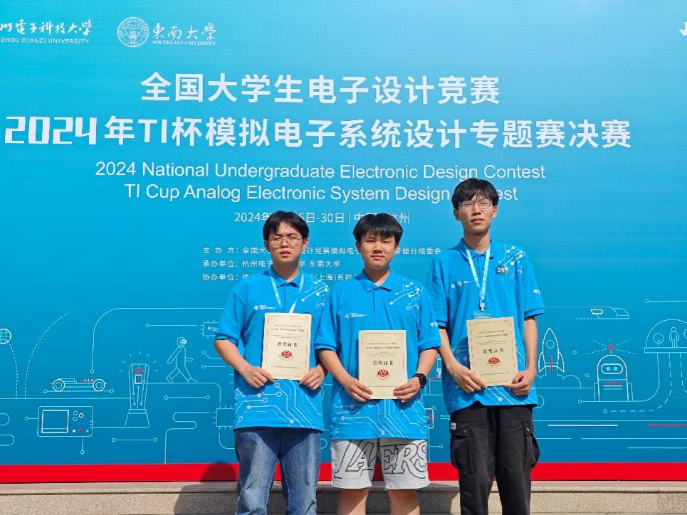 8月27-30日,2024年全国大学生电子设计竞赛模拟电子系统设计专题赛(TI杯)决赛在杭州电子科技大学举行,我校电子与信息工程学院的黄搏涵、邵志彬、余瑞组成的代表队努力拼搏,不负众望,喜获二等奖,实现了我校在专题赛中的重要突破。