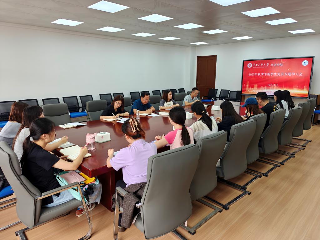 为深入学习贯彻习近平新时代中国特色社会主义思想,切实提升学生党员理论素养,10月11日上午,外语学院召开学生党员学习会,专题学习《习近平谈治国理政》第五卷。学院党委书记李春雷,党委副书记姬扬,各年级辅导员及学生党员代表参会。学院学工办副主任、学生党支部书记王斌主持学习会。