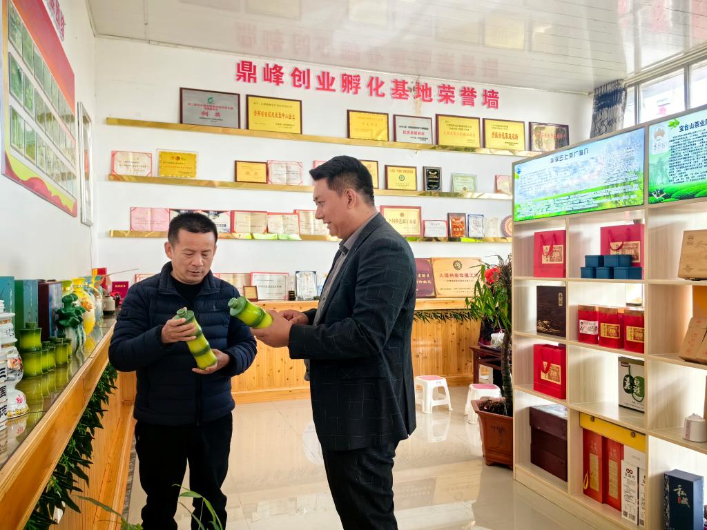 走访大理文化生态保护区龙竹酒制作技艺传习所了解产品情况(左)。