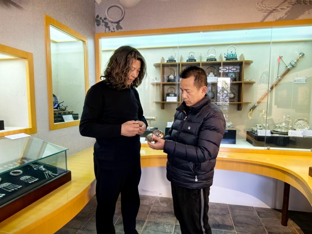 向鹤庆银器锻制技艺国家级代表性传承人学习了解“木纹金”工艺(右)。