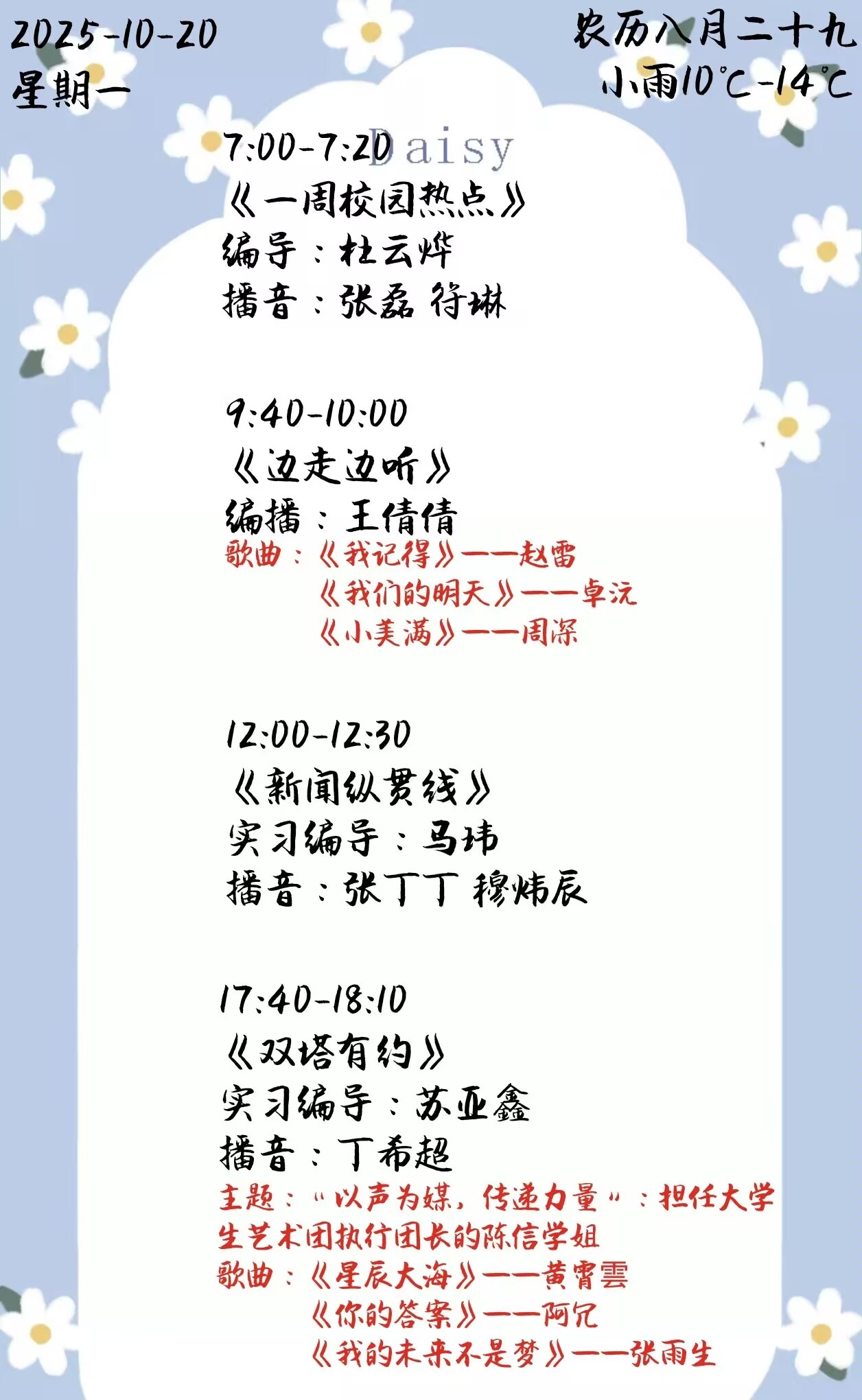 下一篇:双塔之声2025年第二学期第6周节目单(2025.10.13-10.18)