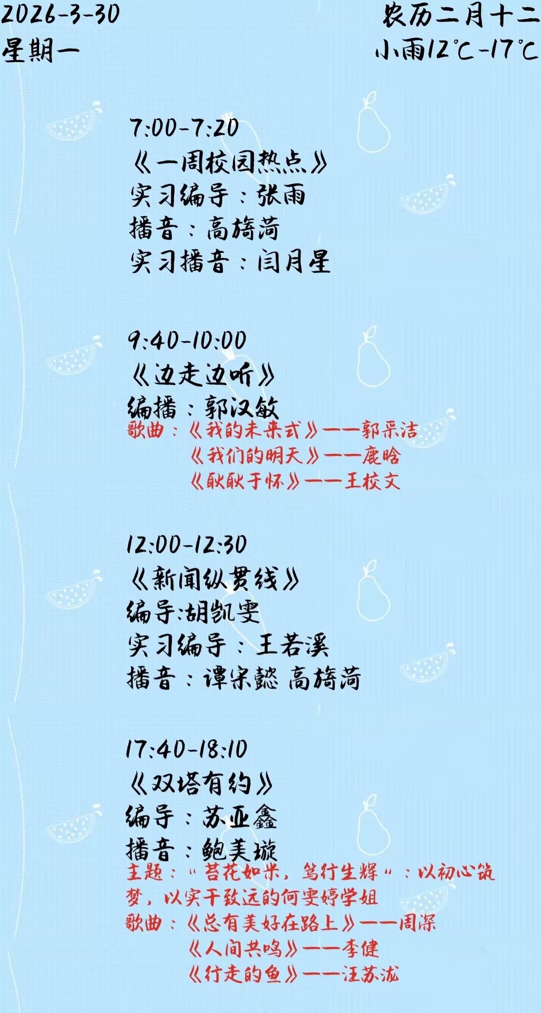下一篇: 双塔之声2026年第一学期第4周节目单(2026.3.23-3.27)