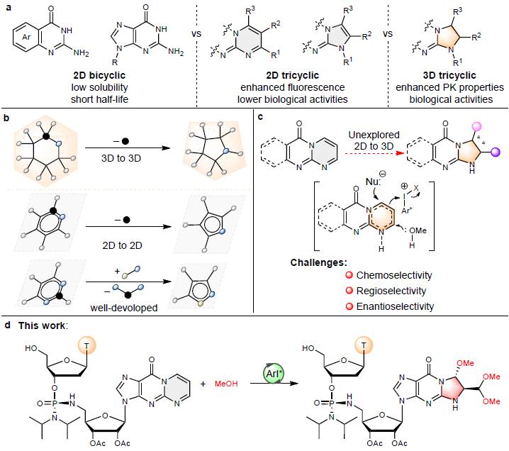 具有生物活性的氮杂环化合物的精准构筑,一直是药物化学和有机合成领域的核心挑战。传统合成方法通常步骤繁琐、条件苛刻,且难以实现对手性三维结构的精准控制,尤其对于缺电子的嘧啶并氮杂环,实现高化学、区域和立体选择性的骨架重排更具挑战。吴滨、孙文武团队发展的手性高价碘催化策略,通过甲氧基的原位引入调控嘧啶环的电子性质和溶解性,进而驱动其发生高选择性环收缩重排,一步构建了多取代的手性咪唑烷稠合氮杂环。该方法具有优异的原子经济性和步骤经济性,底物适用范围广。研究团队结合密度泛函理论计算,深入阐释了反应机理与立体选择性来源,为理性设计高价碘催化反应提供了理论依据。