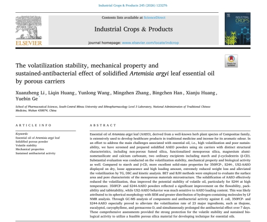 4月,国际知名期刊《工业作物与产品》 (Industrial Crops & Products,一区Top期刊,影响因子6.2)第245卷与读者见面,药学院药物制剂系2023级本科生李炫铮同学以第一作者身份发表了题为The volatilization stability, mechanical property and ustained-antibacterial effect of solidified Artemisia argyi leaf essential oil by porous carriers的研究论文(文章链接:https://doi.org/10.1016/j.indcrop.2026.123276),这是药学院本科生首次以第一作者在该刊发表研究成果。