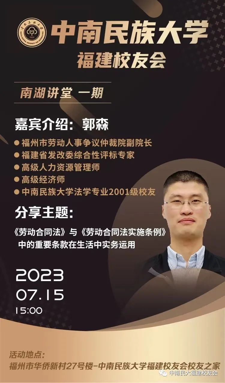 主讲人:郭森,福州市劳动人事争议仲裁院副院长,福建省发改委综合性评标专家,高级人力资源管理师,高级经济师,中南民族大学法学专业2001级校友。