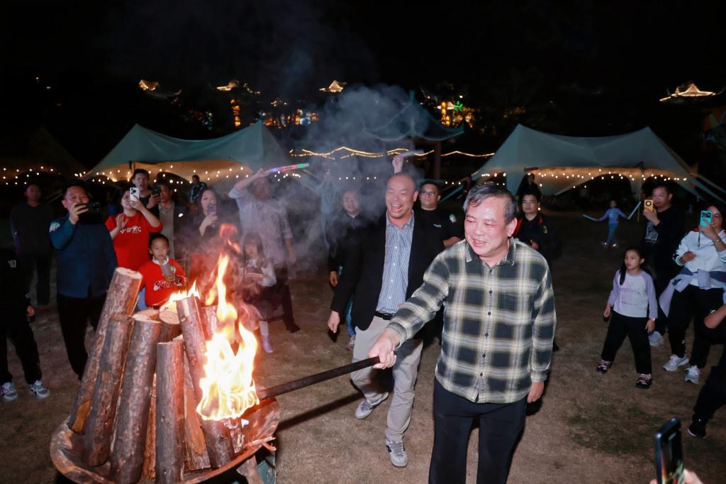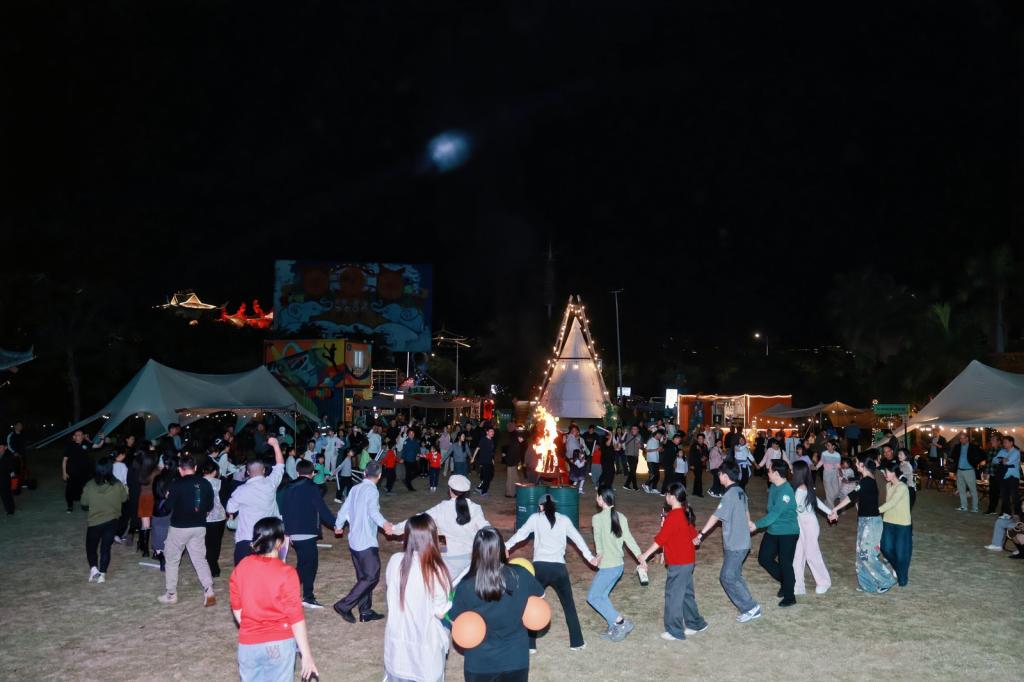 随着夜幕降临,活动迎来重磅环节——篝火点火仪式。1988级经管专业校友、广西校友会创会会长黄全胜,1995级法学专业校友、广西校友会会长陈晓东携手主持仪式,两位校友代表着不同年代的民大记忆,共同点燃了象征情谊与热忱的熊熊篝火。火焰腾空而起,照亮了每张洋溢着笑容的脸庞,也点燃了全场的激情。篝火旁,校友们自发地手拉手围成圆圈,踏着欢快的节拍绕火起舞,不甚娴熟的舞步,却满含纯粹的喜悦与真挚的热忱。火光摇曳、歌声回荡、舞姿翩跹,现场化作一片欢乐的海洋,温暖了邕城的冬夜,也让跨年级、跨专业的校友情谊在火光中愈发深厚。