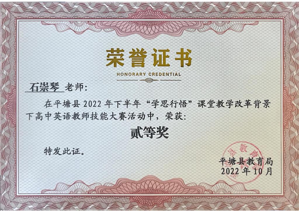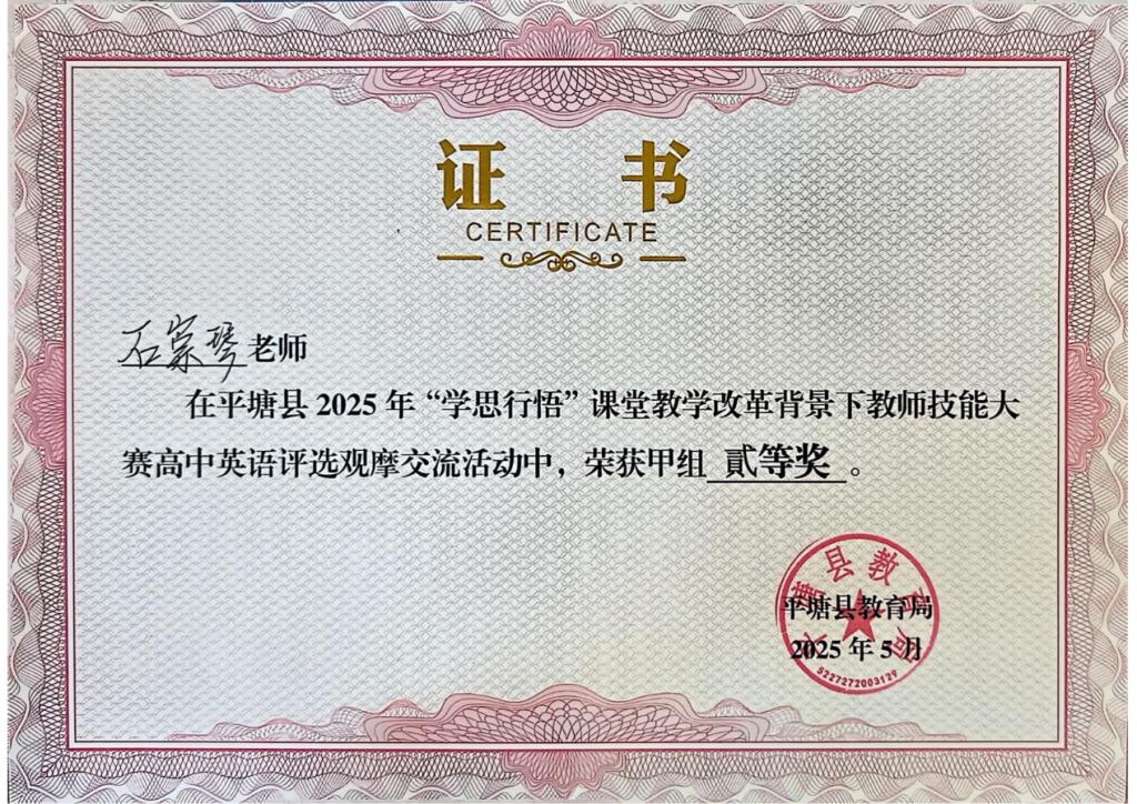 七年耕耘终有获,她所带班级英语成绩常年稳居年级前列。在教学改革的浪潮中,她更是勇立潮头,连续多年在平塘县教师技能大赛、命题大赛中斩获一二等奖,多次获评校级“优秀教师”“优秀教学能手”,用实打实的成绩成为当地教学创新的标杆。