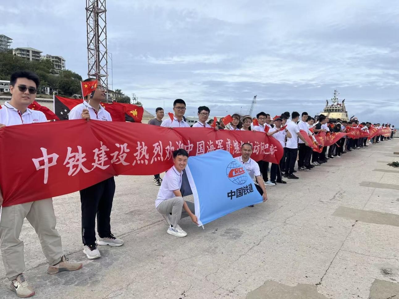 在中国海军戚继光舰访问巴新期间,王志校(前一)组织公司党员到港口迎接出访巴新的中国海军军舰并参与访问保障工作