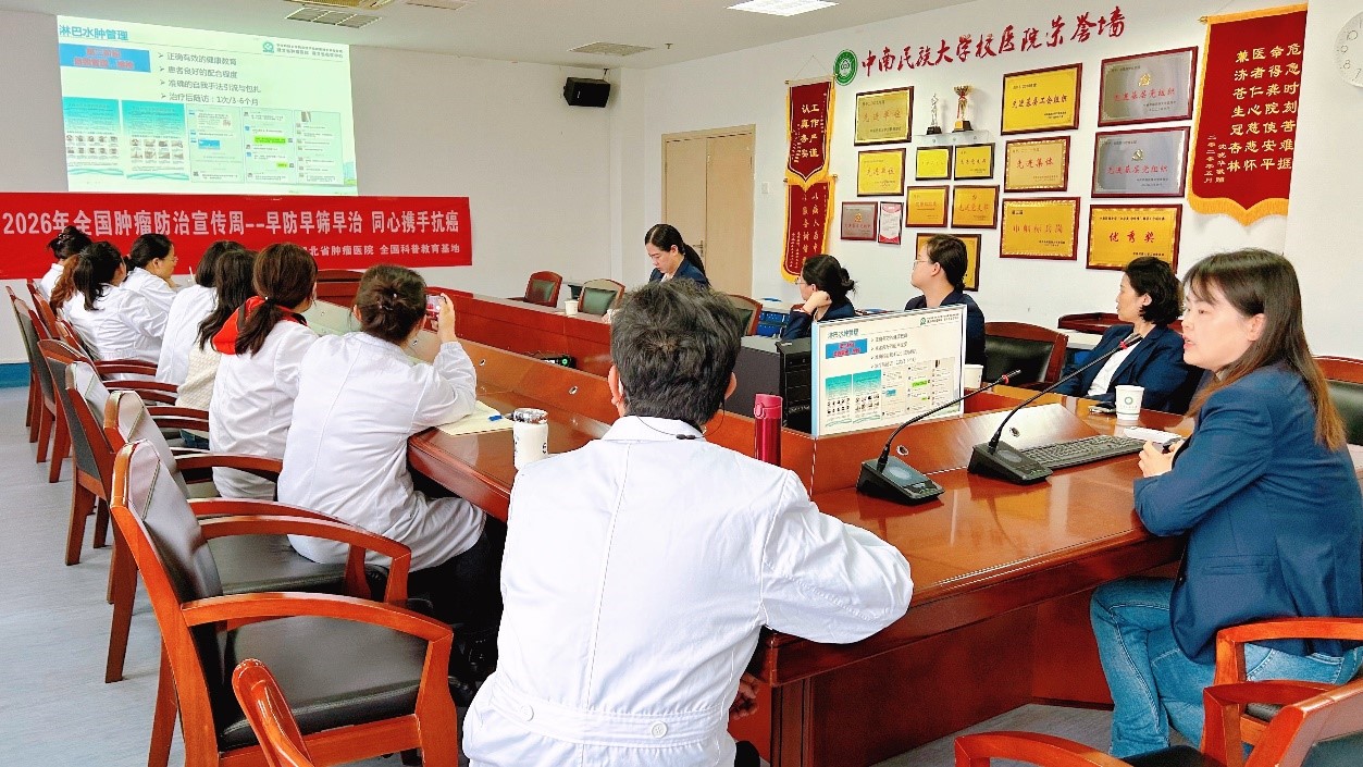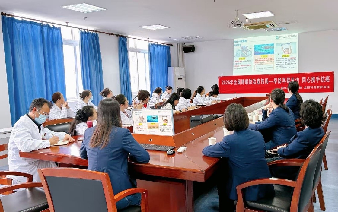 在2026年全国肿瘤防治宣传周到来之际,为进一步提升高校医院临床护理专业技能,深化院校医疗合作内涵,推动肿瘤患者全生命周期健康管理理念在基层医疗机构的延伸,4月14日下午,湖北省肿瘤医院护理专家团队一行莅临我院开展了一场高水准的专科护理培训讲座。校医院全体护理人员及相关临床科室骨干参加了此次培训。