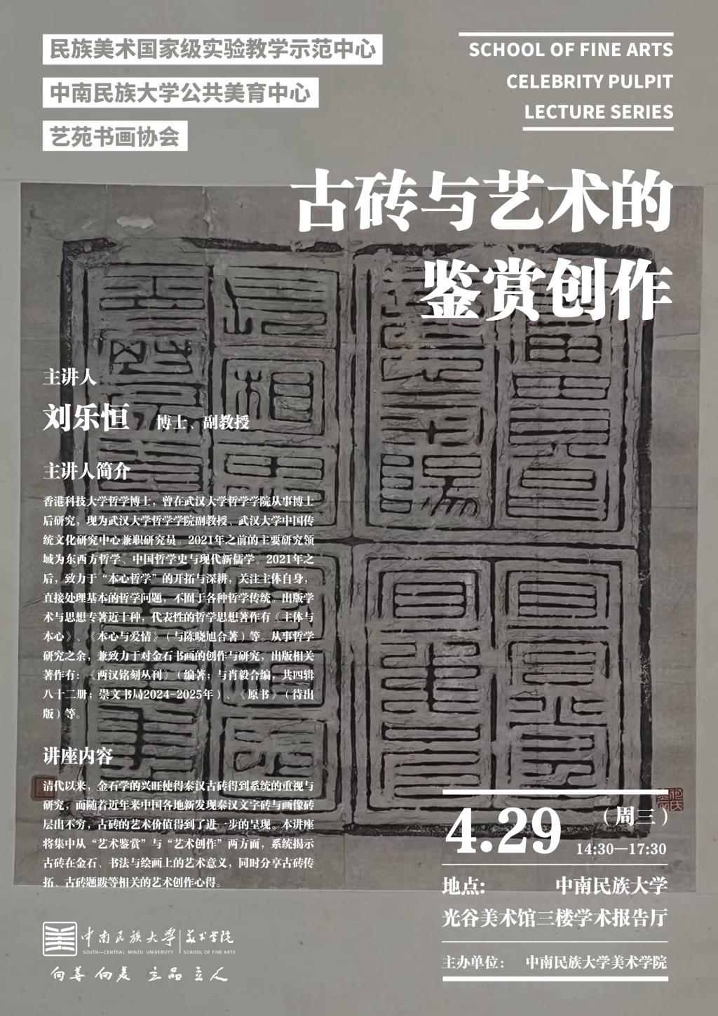 学术讲座:古砖与艺术的鉴赏创作(主讲人:刘乐恒,2026年4月29日14:30,光谷美术馆三楼学术报告厅)