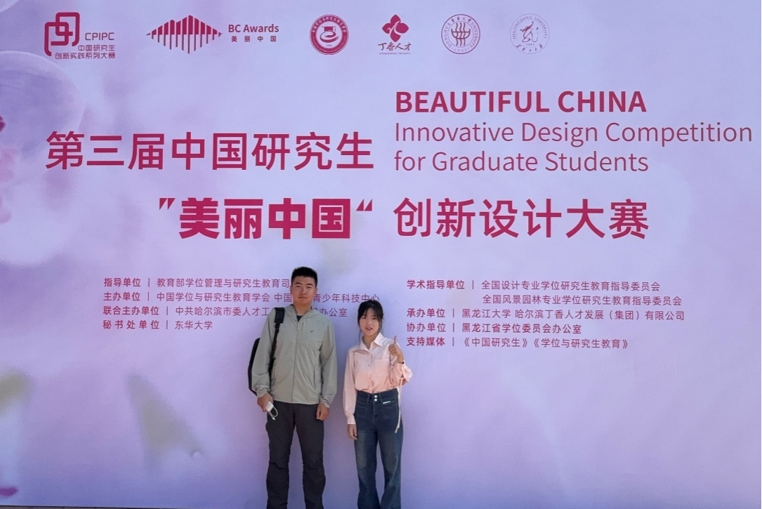 这是我校研究生院第一次组织研究生团队参加该项赛事,美术学院学子积极参赛并载誉归来。“青设山河”团队苏巧玉、张弘毅同学前往哈尔滨现场参加总决赛并荣获二等奖。苏巧玉表示,虽是首次参加该设计大赛却收获颇丰。在国赛答辩现场,评委老师提出的建议和意见十分精准,不仅帮他们团队清晰看到了自己作品在专业领域有待提升,也让她清晰地意识到了自己与顶尖水平的差距。这份差距激发了她继续沉下心钻研技术、打磨好每一行代码的决心和动力。今后,他们将带着对专业的敬畏向优秀者看齐,努力在专业创新实践这条赛道上走得更稳、更远。