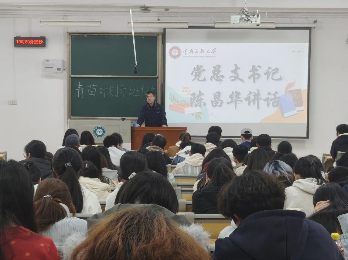 仪式尾声,陈昌华书记发表致辞。他首先对新一届加入“青苗计划”的“青苗”们表示热烈祝贺与诚挚欢迎,随后结合自身经历与时代要求,阐述了青年一代肩负的历史重任,强调学风建设对个人成长与学院发展的重要意义。