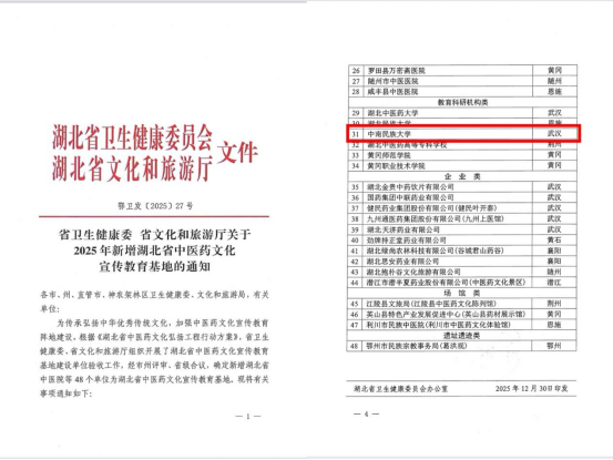 近日,湖北省卫生健康委员会、湖北省文化和旅游厅联合发文,公布了2025年新增湖北省中医药文化宣传教育基地名单。由我校药学院牵头申报的“铸牢中华民族共同体意识传承中药民族药文化宣传教育基地”成功获批,这是我校在中医药(民族医药)文化传承、创新与科普教育领域取得的又一重要成果,标志着学校在该领域的建设水平获得了省级权威认可。