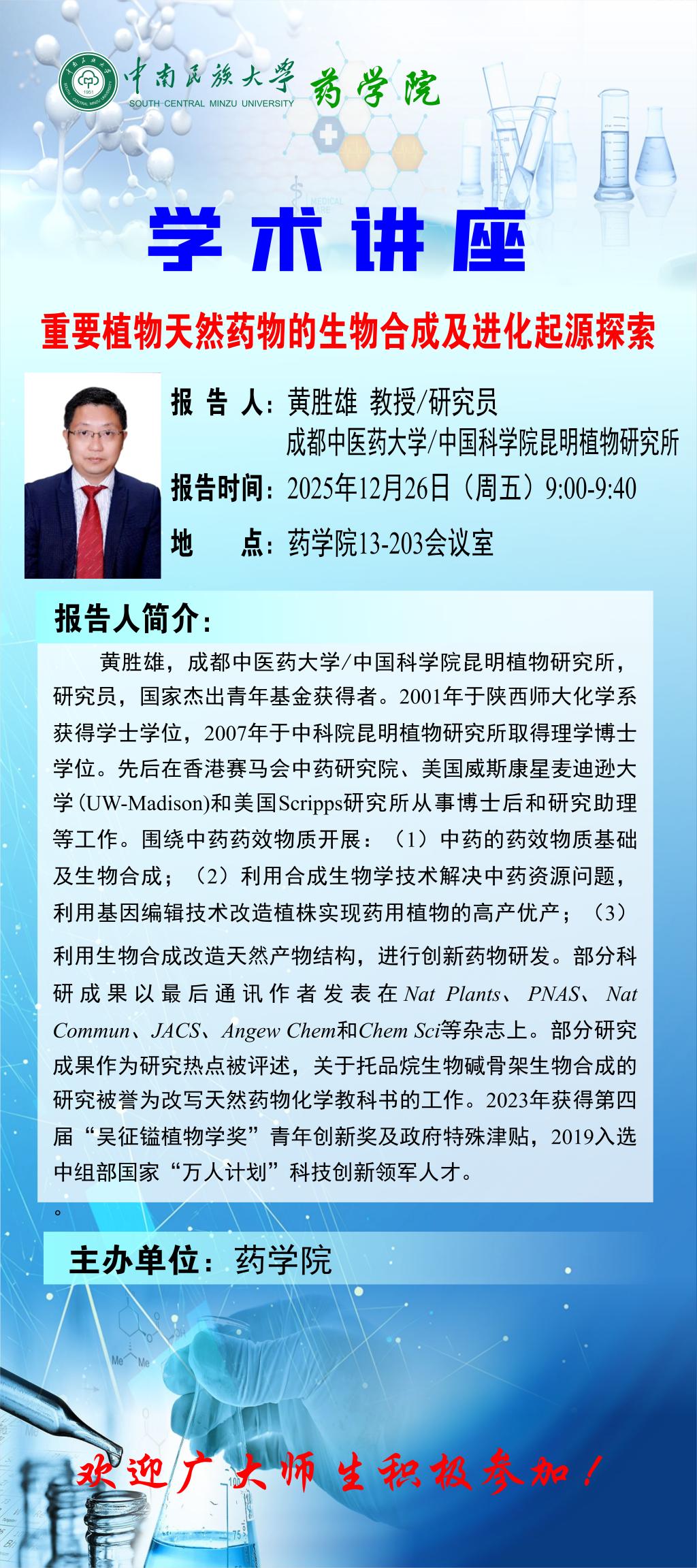 【学术讲座】重要植物天然药物的生物合成及进化起源探索