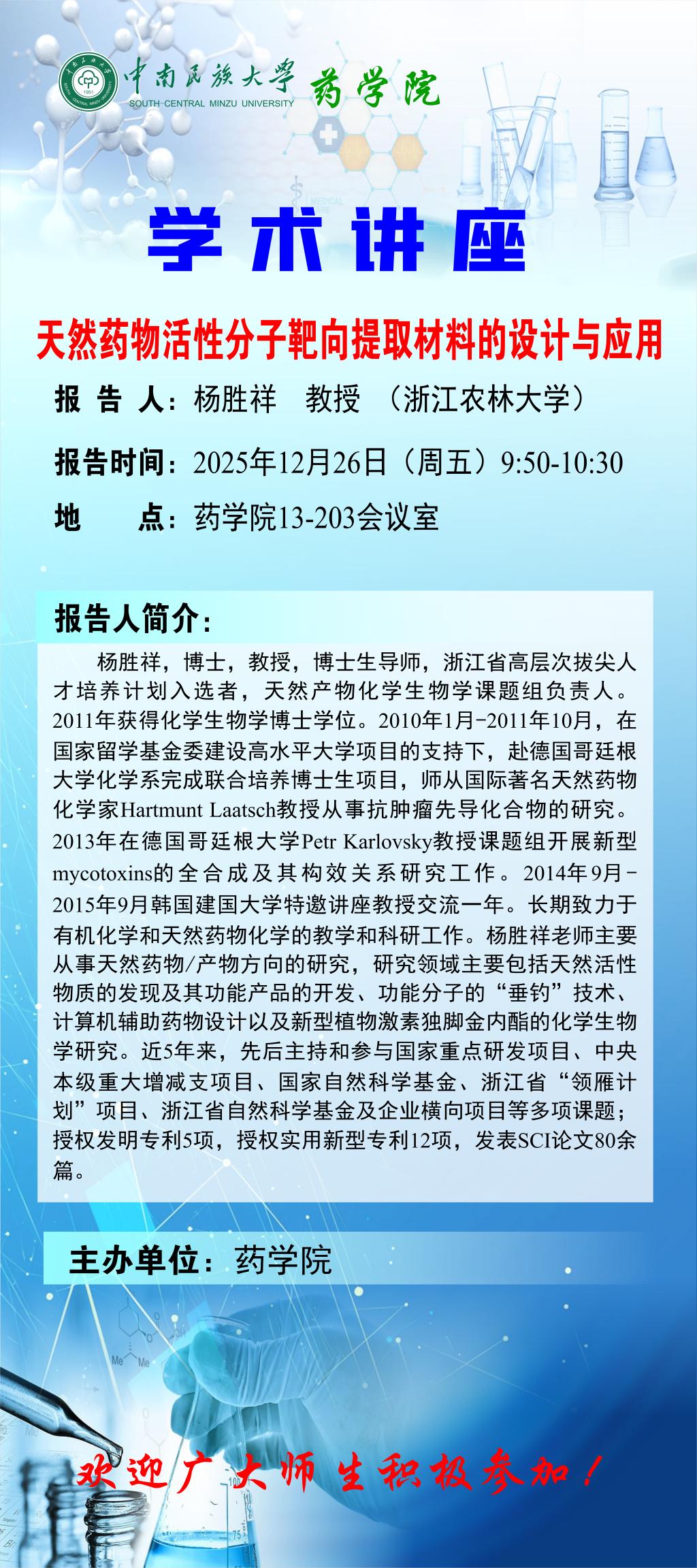 【学术讲座】天然药物活性分子靶向提取材料的设计与应用
