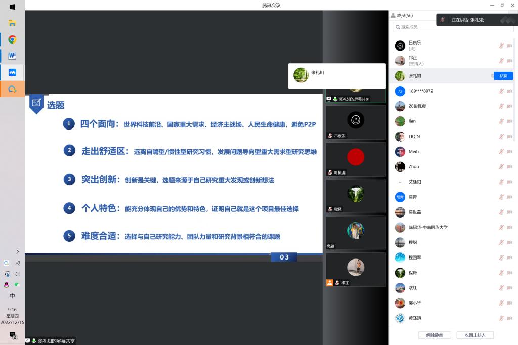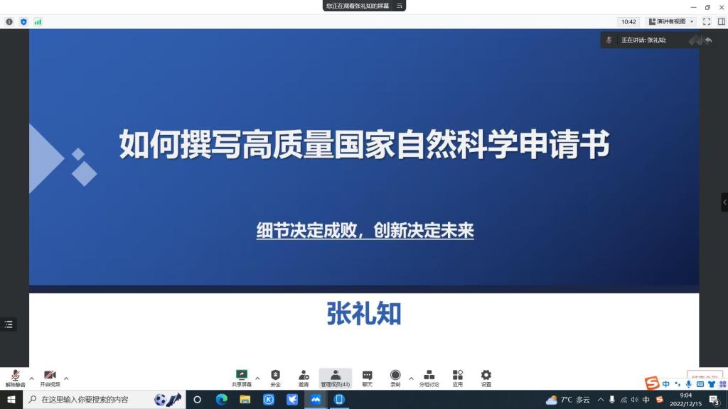 (通讯员:杜亚光)受我院邀请,来自上海交通大学环境科学与工程学院的特聘教授张礼知老师,于2022年12月15日上午为我院老师做了一场题为《如何撰写高质量国家自然科学基金申请书》的线上报告,旨在提高我院教师国家自然科学基金申报书的撰写质量。本次腾讯线上报告会,由我院副院长吕康乐教授主持。