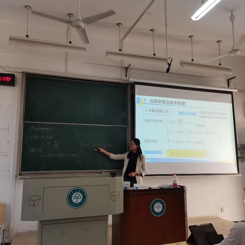 杜鸿老师的授课内容为《水文预报》课程中的“河道流量演算与洪水预报”,从复习回顾特征河长法展开,由2020年长江流域大洪水期间,万宜-宜昌河段洪水预报引入马斯京根法的讲解,课程内容层层递进,讲解与存在的环境问题融会贯通,让同学们对于知识的学习并不只局限于书本,而是与工程相结合、与实际相结合。课堂上同学们积极参与,在杜鸿老师讲述相关环境实例时,同学们竞相发言,学习氛围积极活跃,教学效果十分良好。