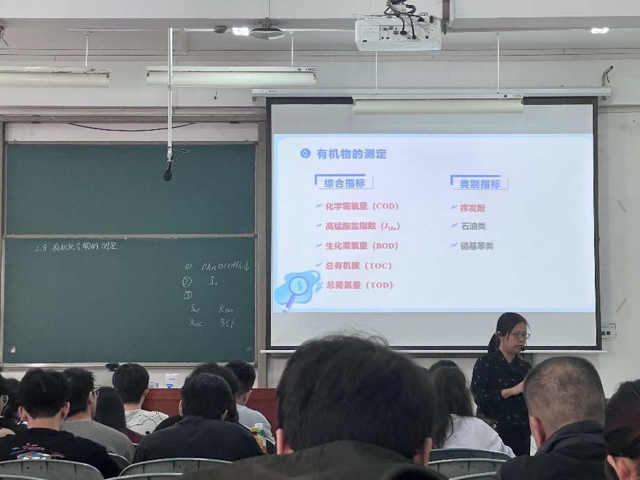 常青老师的课程从松花江硝基苯污染事件和身边的武汉南湖水污染事件导入,首先复习相关专业知识,引入有机物测定的综合指标和类别指标。课程由浅入深,除了有机污染物测定的专业知识传授,更重价值引领,将习近平生态文明思想、科学发展观、工匠精神以及环境人的专业荣誉感和使命感等思政教育融入课程教学;结合案例引导学生思考,充分调动学生的积极性,培养学生分析和解决实际问题的能力,同学们参与讨论的热情高,课堂气氛活跃。
