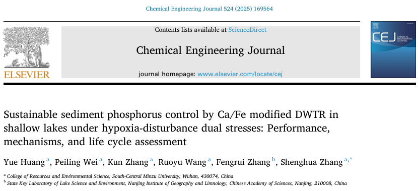 近日,我院张胜花教授课题组在化工和环境工程领域权威期刊《Chemical Engineering Journal》(中科院一区TOP,IF=13.2)上发表题为“Sustainable sediment phosphorus control by Ca/Fe modified DWTR in shallow lakes under hypoxia-disturbance dual stresses: Performance, mechanisms, and life cycle assessment”的最新研究成果。第一作者为我校资环学院硕士研究生黄悦,论文通讯作者为张胜花教授,中南民族大学为唯一通讯单位。