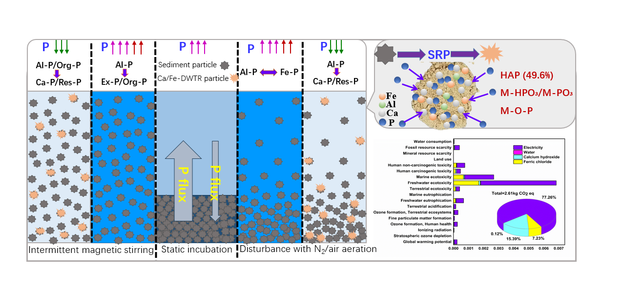 本研究通过共沉淀法制备了Ca/Fe-DWTR,最大吸附容量达82.24 mg P/g。其吸附性能受pH值、共存离子和腐殖酸的影响极小,在广泛的水环境条件下均能保持稳定的除磷效果,解决了传统材料适应性差的关键问题。借助TEM-EDS、XRD、XPS多种表征技术揭示了Ca/Fe-DWTR的磷吸附机制:通过形成羟基磷灰石、金属-磷酸氢盐/磷酸盐沉淀以及内层金属-氧-磷络合物实现磷的高效固定,吸附后的磷主要以稳定的钙结合态形式存在,显著降低了磷的二次释放风险。Ca/Fe-DWTR通过将不稳定的磷形态(如铝结合态磷、有机磷)转化为稳定的钙结合态磷和残渣态磷有效抑制沉积物磷释放。生命周期评估结果表明,Ca/Fe-DWTR制备过程的环境影响较小,该材料以工业副产物为原料,既实现了废弃物的资源化利用,又降低了制备成本,在缺氧及频繁扰动的浅水湖泊富营养化沉积物修复中具有显著应用潜力。