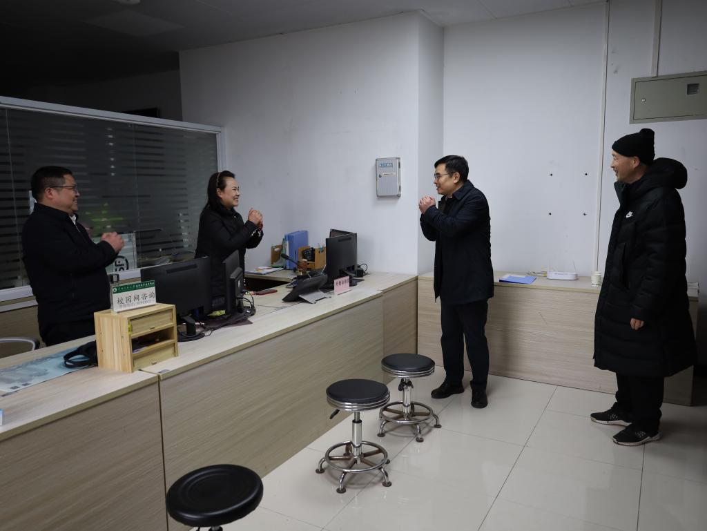 在学校二食堂,徐业勤关切询问留校师生的用餐情况,详细了解假期伙食供应和特色菜品准备。他与现场工作人员亲切交流,为大家送上美好祝福。在信息化建设管理处,徐业勤询问了假期校园网络运行保障情况,对工作人员保障校园信息畅通、服务师生需求的辛勤付出表示肯定。在保卫处,徐业勤对保卫战线同志们“舍小家、顾大家”,为维护校园秩序、服务师生所做出的奉献表示感谢,他还专门看望了校园110服务站和坚守在各门岗的工作人员,与正在执勤的安保人员一一握手,叮嘱大家注意防寒保暖,以良好状态守好校园安全的第一道防线。在校医院,徐业勤对医护人员在过去一年以及春节期间为守护师生健康表示感谢,希望大家继续发扬优良作风,为师生提供更加便捷、优质的医疗服务。