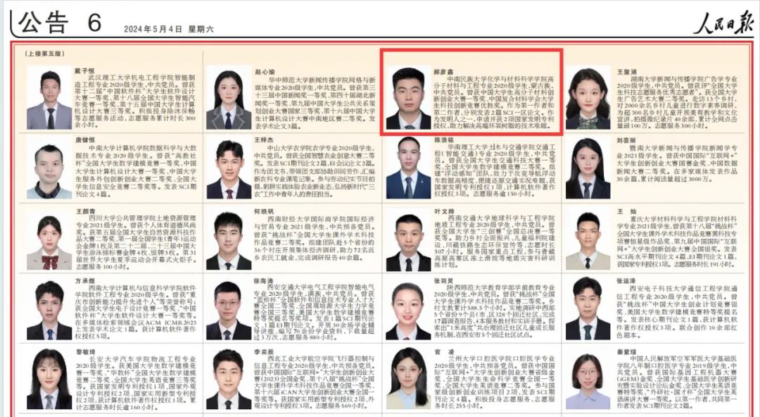 国家奖学金获奖学生代表郝彦鑫的优秀事迹在《人民日报》刊发。