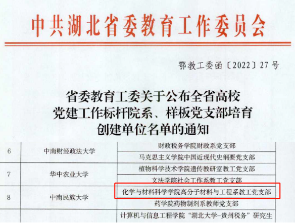 高分子材料与工程系教工党支部获评湖北省首批“样板党支部”。学院供图