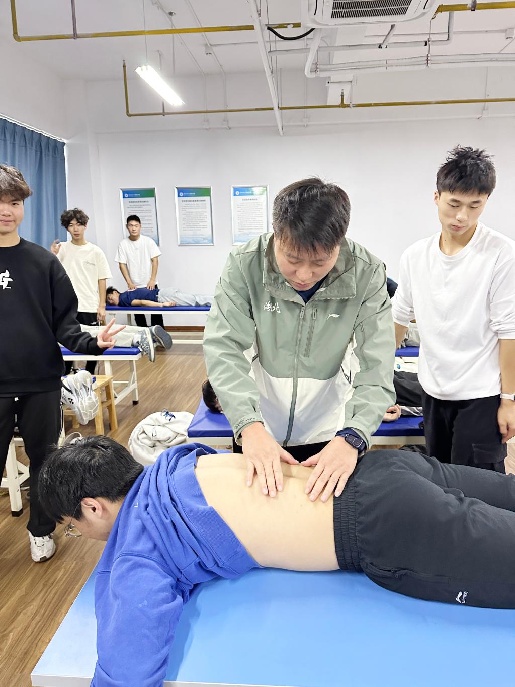 “你是上学期武术班的同学吧?”金宁老师将凳子递给登门拜访的记者时,笑着开口道。只一眼,他就认出了自己曾教过的学生。金老师的办公室是一间按摩室,室内宽敞明亮。左边是办公区,桌上整齐摆放着人体按摩模型和相关教材;右侧则放置了数十张按摩床,广受同学们欢迎的《推拿与按摩》课程就在这里进行。