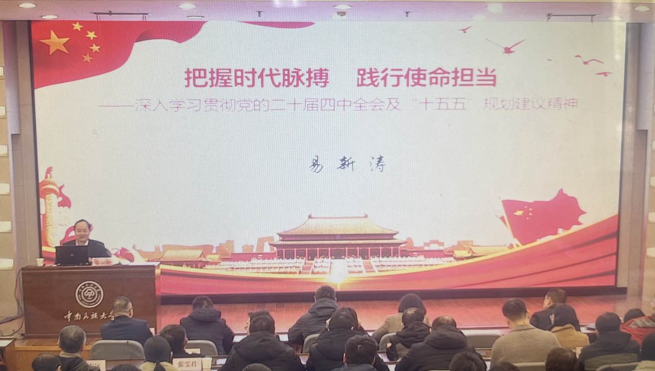 为深入学习宣传贯彻党的二十届四中全会精神,引导机关党员干部切实把思想和行动统一到党中央决策部署上来,12月17日,机关党委在学术交流中心国际厅举办党的二十届四中全会精神专题辅导报告会。学校宣讲团成员、马克思主义学院易新涛教授应邀作专题宣讲,机关党委全体党员通过线上与线下相结合的方式参加。机关党委书记周刚主持报告会。